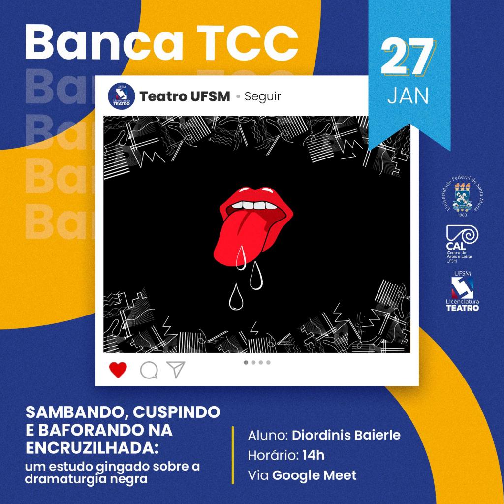 No dia 27/01, teremos a Defesa do Trabalho de Conclusão de Curso do aluno Diordinis Baierle, orientado pela Profa. Fabiana Siqueira Fontana e denominado “Sambando, Cuspindo e Baforando na Encruzilhada: um estudo gingado sobre a dramaturgia negra”. A apresentação será transmitida através da plataforma Google Meet.