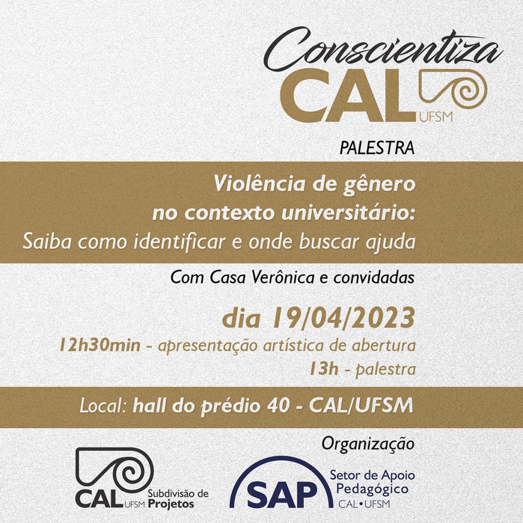 Através do Conscientiza Cal e em parceria com a Casa Veronica e convidados, gostaríamos de divulgar a palestra “Violência de gênero no contexto universitário: saiba como identificar e buscar ajuda”. Irá acontecer no dia 19 de abril, no hall do CAL– prédio 40. Às 12h:30min terá uma apresentação artística para a abertura e às 13h será a palestra. Esperamos vocês!