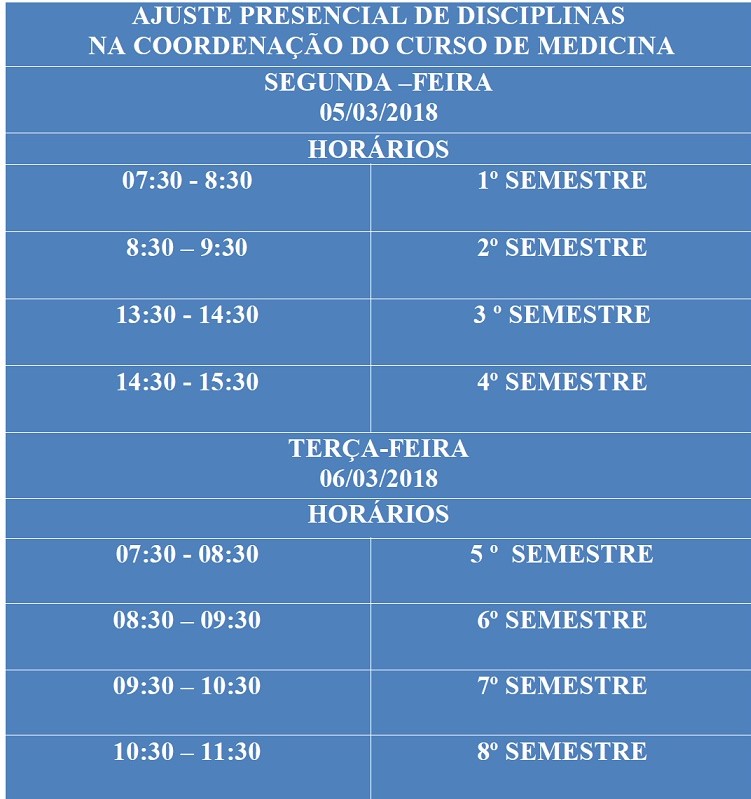 A coordenação do Curso de Medicina informa os horários  para a realização do ajuste presencial de matrículas na secretaria do curso.