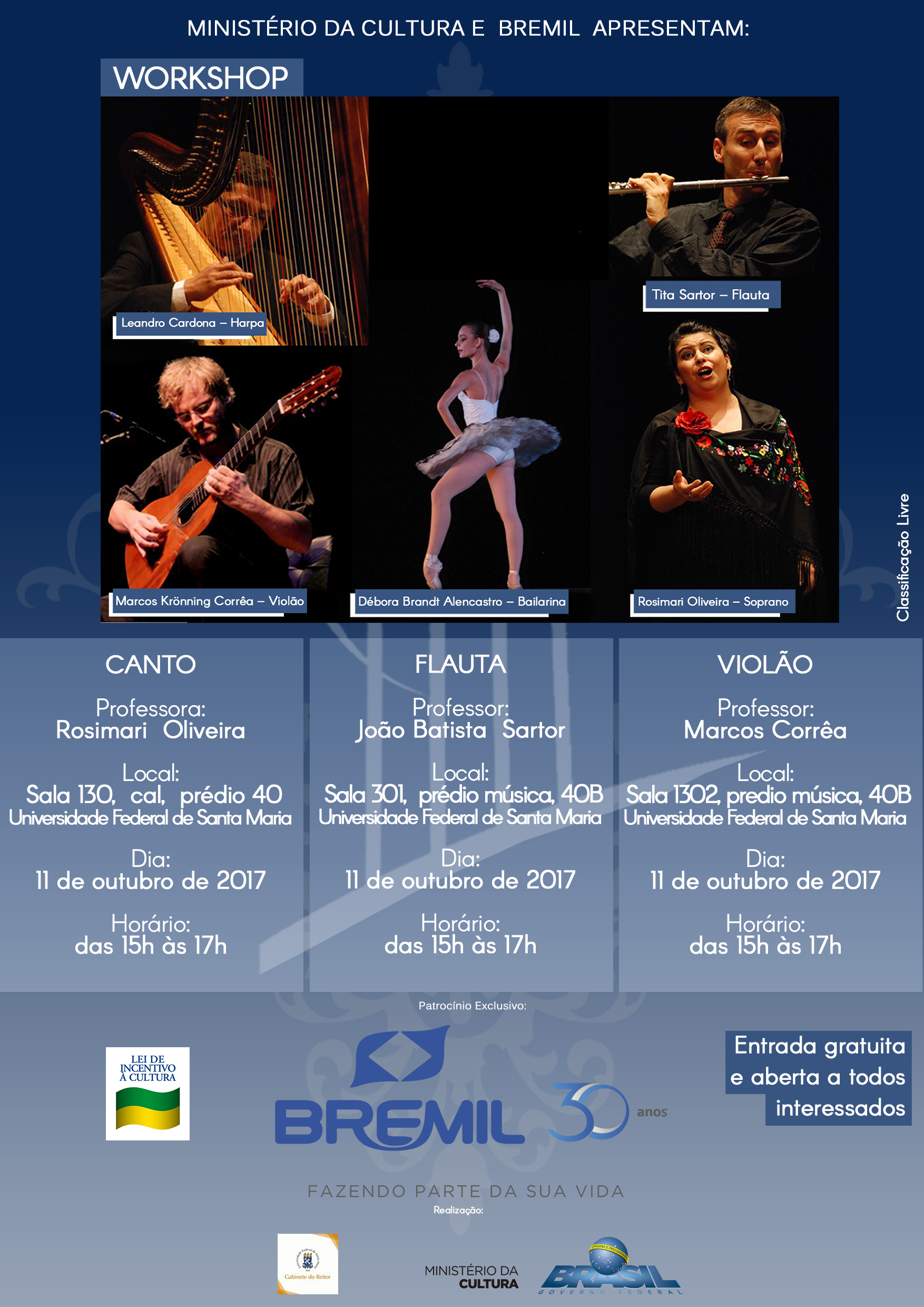 No mesmo dia haverá workshop ministrada pelos professores do espetáculo. A oficina de canto pela professora Rosimari Oliveira no horário das 15h às 17h na sala 130 (CAL – predio 40). O professor João Batista é responsável pela oficina de flauta que acontece no mesmo dia das 15h às 17h na sala 301 (CAL – prédio 40B). Por fim a oficina de violão por Marcos Corrêa é ofertada no mesmo horário (15h às 17h) na sala 1302 (CAL – prédio 40B).