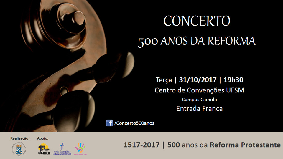 Concerto dos 500 Anos da Reforma aconteceu no dia 31 de Outubro, às 19h30, no Centro de Convenções UFSM. Sob orientação do Professor Cláudio Esteves o concerto teve a participação do Coro de Câmara, Coral da UFSM, Coral da Congregação Luterana Cristo, participantes da Associação Orquestrando Arte e convidados. Além disso, outros professores do curso participaram desse evento como Lúcius Mota (Oboé), Pedro Persone (Cravo), Clayton Miranda (Trompete) e Gilmar (percussão).