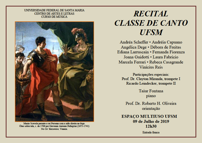 O Bacharelado em Canto do Curso de Música da UFSM apresenta seu recital de final de semestre. Serão oferecidas obras do repertório nacional e internacional de diversos compositores em épocas e estilos diferenciados. Obras de Vivaldi, Handel, Mozart, Verdi, Lorenzo Fernandes, Francisco Mignone e outros. Peças camerísticas e operísticas. Participação especial do prof. Dr. Clayton Miranda e do acadêmico Ricardo Leindecker nos trompetes I e II. Ao piano Taiur Fontana. Todos sob a orientação do prof. Dr. Roberto H. Oliveira. O evento se realizará no Espaço Multiuso, dia 09 de julho (terça-feira) às 12h30min, entrada franca.”
