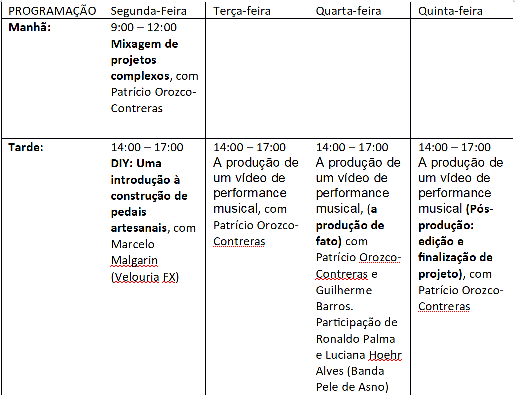 Em paralelo às atividades gerais, também ocorrerão oficinas extras oferecidas pelo curso de Música e Tecnologia.