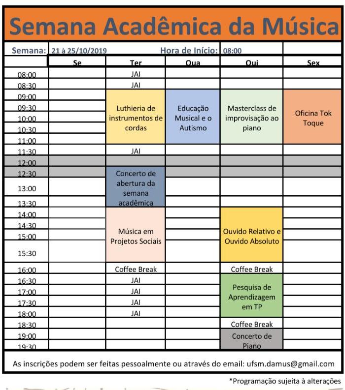 A partir dessa segunda-feira (21/10) inicia a Semana Acadêmica da Música, serão oferecidas diversas oficinas, palestras e workshops ao longo da semana.