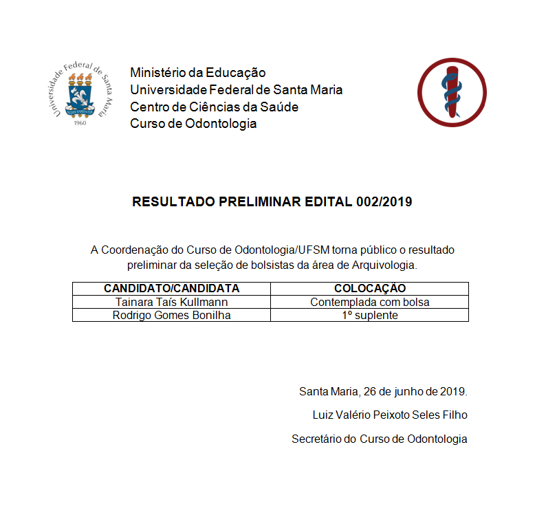 Resultado Preliminar Edital 002/2019 bolsista da área de arquivologia