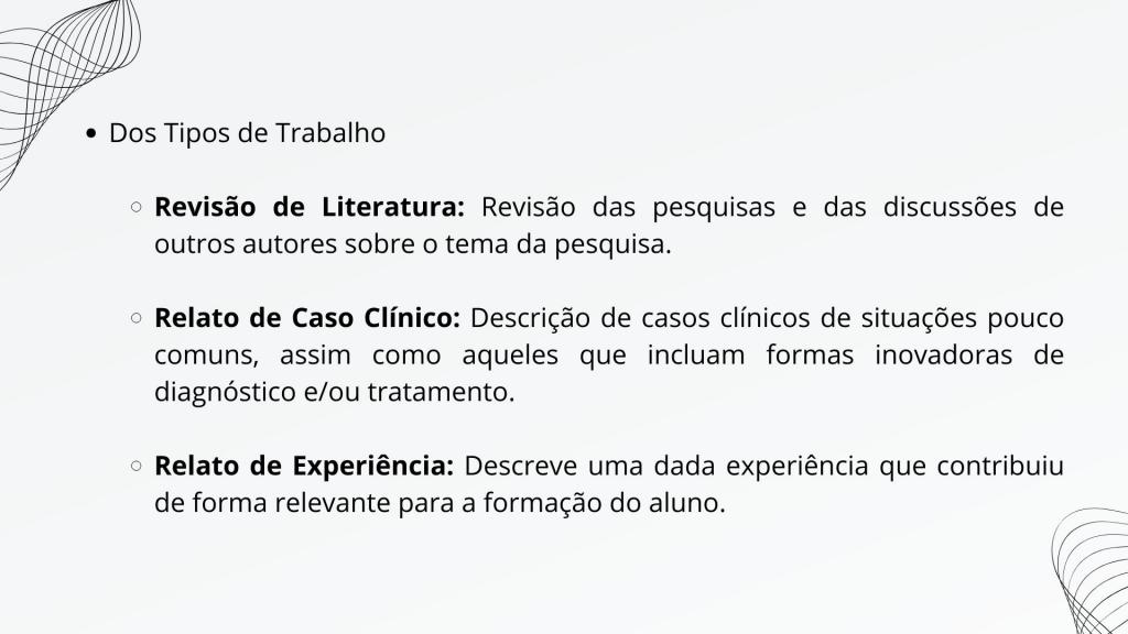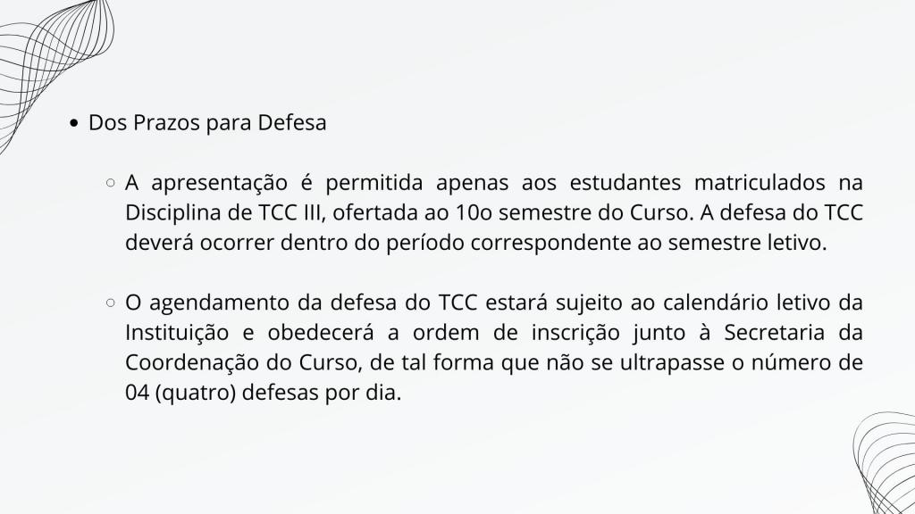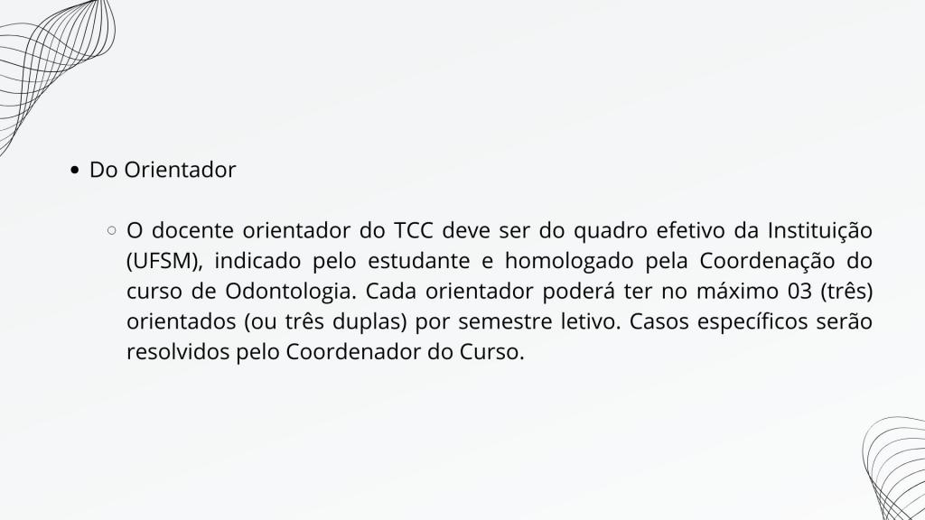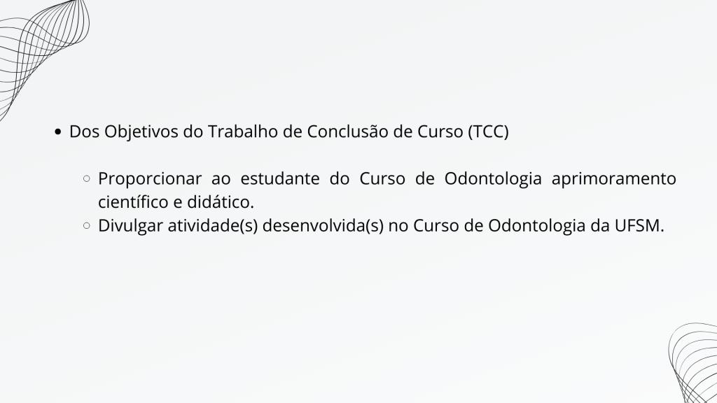 O Trabalho de Conclusão de Curso (TCC) é obrigatório como requisito final necessário para ser graduado em Odontologia pela Universidade Federal de Santa Maria. Nas disciplinas de TCC os estudantes, sob orientação de um docente, desenvolverão e apresentarão de forma escrita e oral o Trabalho de Conclusão de Curso, no 10° semestre, versando sobre tema referente à Odontologia. (Para o arquivo de normas completo clique aqui).