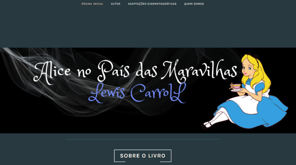 Objetivo do site: O trabalho realizado na disciplina de Produção Editorial para Web tem por objetivo a criação de um site sobre um livro de domínio público, na plataforma WordPress. A obra escolhida para ser abordada em nosso site foi Alice no País das Maravilhas, de Lewis Carroll. No site exploramos dados sobre o livro, diferentes edições, vida do autor e criação da obra e adaptações cinematográficas. O objetivo é que pessoas que têm interesse na história de Alice, conheçam um pouco mais acerca da obra. O template que utilizamos para a criação do site na plataforma WordPress foi “Pique”. As cores utilizadas no projeto gráfico foram preto, azul, branco por remeterem a obra.