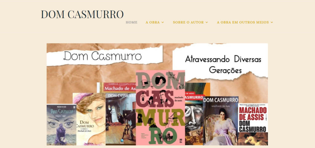 Objetivo do site: O presente site possui o propósito de homenagear um dos grandes nomes da literatura brasileira, Machado de Assis, através de sua obra nomeada Dom Casmurro. A partir de conteúdos selecionados com a intenção de divulgar essa obra, o site busca atrair o público jovem que precisa dessas informações para seus estudos no Ensino Médio e também aqueles que se interessam por obras do Realismo brasileiro.