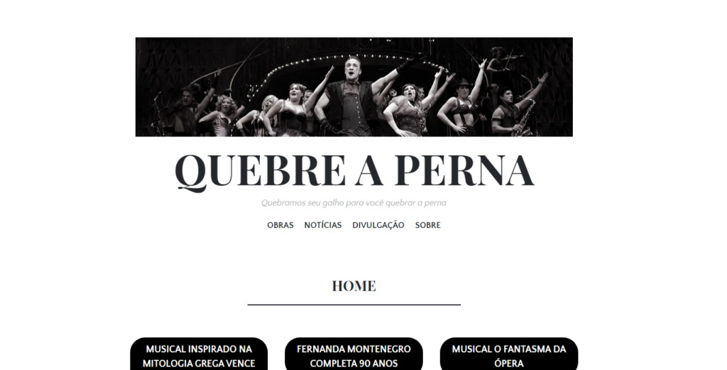 Objetivo do site: O site Quebre a Perna pretende ser uma plataforma de valorização do teatro, com a divulgação e adaptação para a leitura de textos, em domínio público, de peças de teatro para os leitores-atores e, como extra, ainda dispõe de notícias e divulgação de eventos que ajude fomentar a comunidade.