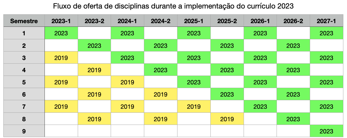 - A implementação será concluída em 2025-2, de modo que a partir de 2026-1 somente as disciplinas do currículo proposto passarão a ser ofertadas.