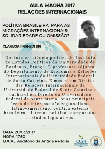 Acontecerá no próximo dia 20 de Março a Aula Magna 2017 do Curso de Relações Internacionais da UFSM. A palestrante será a Prof. Dra. Clarissa Franzoi Dri (UFSC), que falará sobre a “Política Brasileira para as Migrações Internacionais: Solidariedade ou omissão?”. O Evento acontecerá as 17:30, no auditório da Antiga Reitoria.