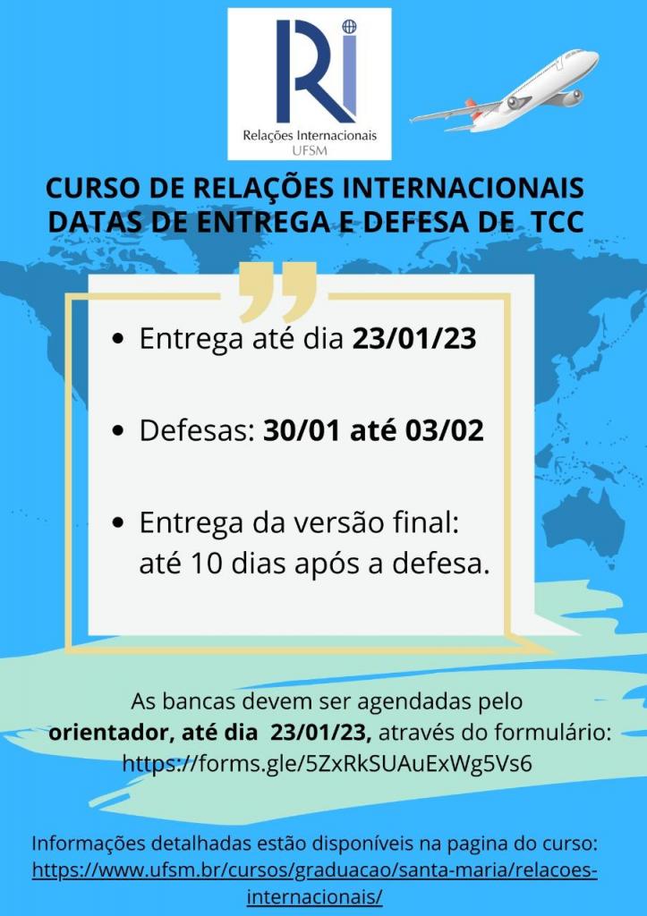 – Bancas devem ser agendadas PELO ORIENTADOR ATÉ O DIA 23 DE JANEIRO DE 2023 via Formulário: https://forms.gle/5ZxRkSUAuExWg5Vs6