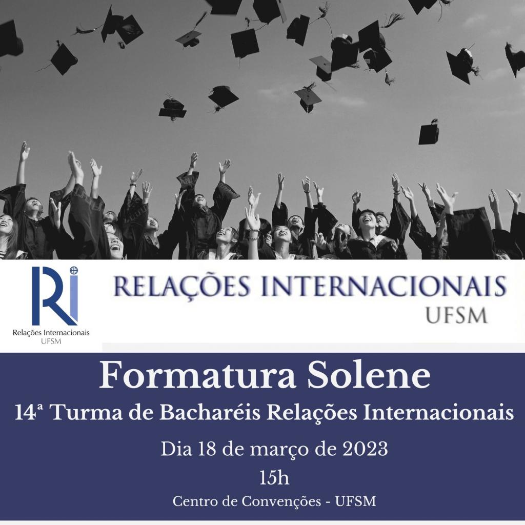 No dia 18 de março de 2023, às 15 horas, está marcada a Formatura Solene da 14ª Turma do curso de Relações Internacionais da UFSM. O evento irá ocorrer no Centro de Convenções e a outorga de grau aos formandos será realizada na ocasião pelo Professor Günther Richter Mros, atual coordenador do curso.