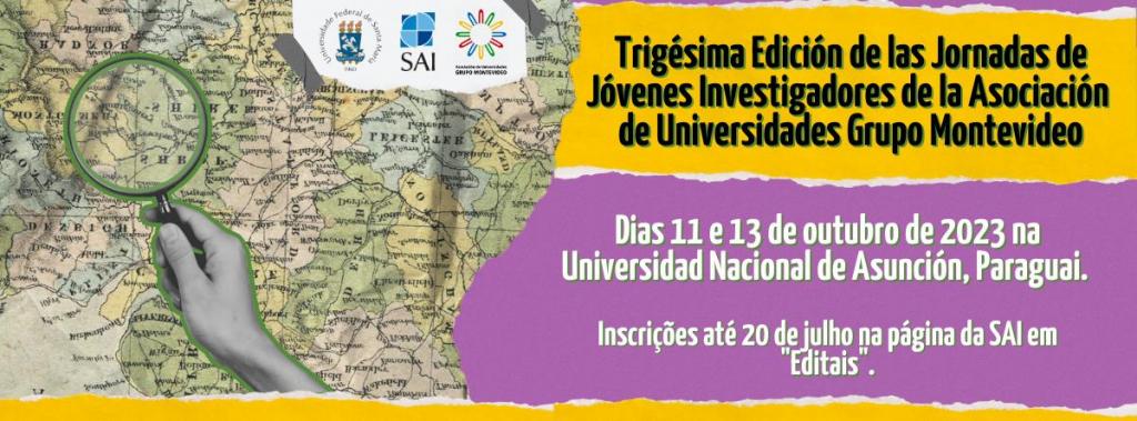 Estamos divulgando o Edital de seleção de trabalhos para apresentação na “TRIGÉSIMA EDICIÓN DE LAS JORNADAS DE JÓVENES INVESTIGADORES DE LA ASOCIACIÓN DE UNIVERSIDADES GRUPO MONTEVIDEO”.