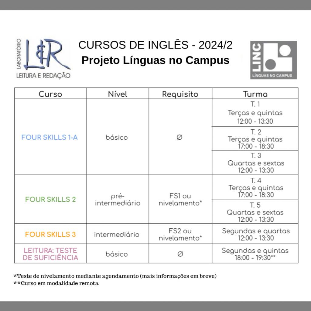 Os cursos oferecidos são divididos em duas modalidades: habilidades integradas – ler, ouvir, falar e escrever (Four Skills) – e leitura de textos acadêmicos em inglês (preparatório para o Teste de Suficiência).