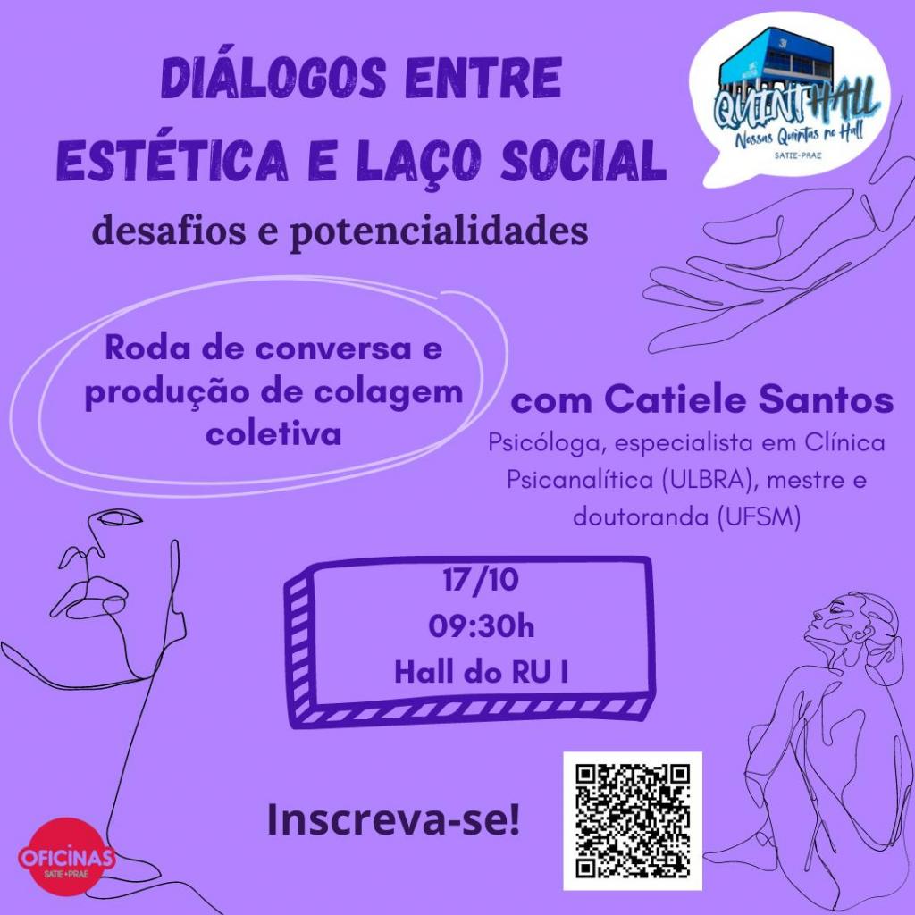 Projeto QuintHall anuncia e convida para o encontro temático “Estética e Laço Social: desafios e potencialidades”, que será mediado pela psicóloga, especialista em clínica psicanalítica (ULBRA), mestre e doutoranda (UFSM) Catiele Santos. A roda de conversa contará com espaço de diálogo, compartilhamento de experiências e produção de uma colagem coletiva, sendo um espaço aberto a tod@s, dedicado a pensar sobre questões que impactam na saúde mental universitária.