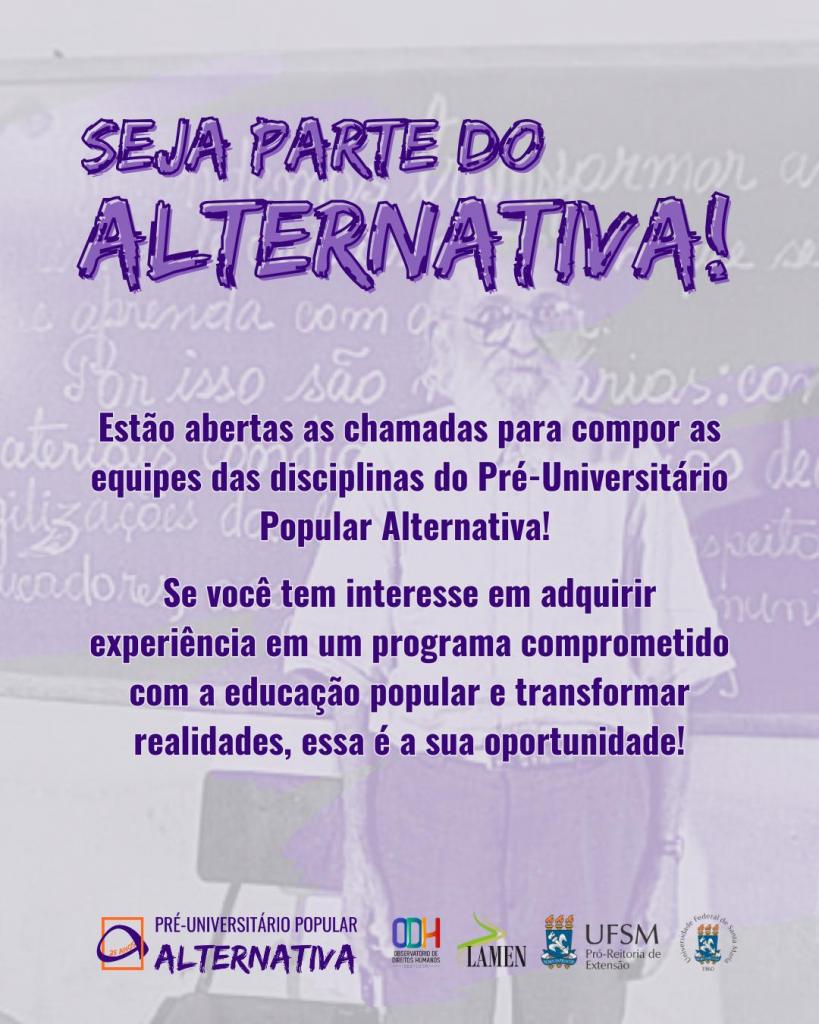 Se você tem interesse em atuar na educação popular e contribuir para a construção de um ensino acessível e transformador, essa é a sua oportunidade! O Alternativa é voluntário e busca pessoas comprometidas, dispostas a ensinar e aprender. Além disso, o programa gera certificado de frequência como professor!