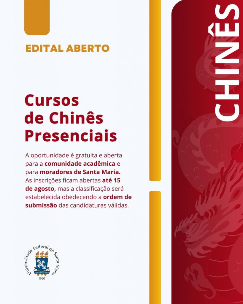 A UFSM está com edital aberto para inscrição em aulas presenciais de chinês, que serão ministradas por professoras nativas na CLEC Smart Classroom. As vagas são limitadas e a classificação é por ordem de inscrição, além disso há vagas exclusivas para a comunidade externa.