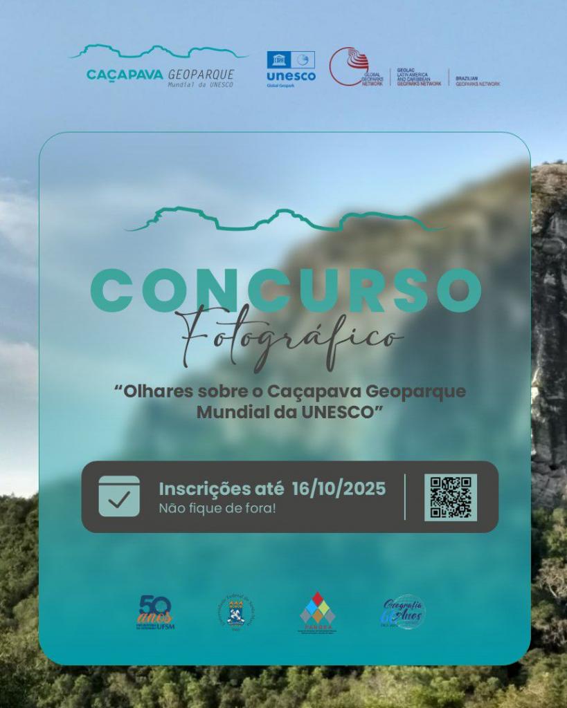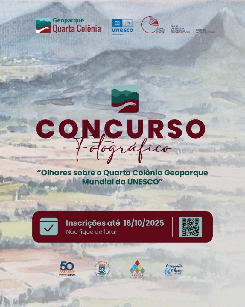 Em alusão aos 60 anos do curso de Geografia da Universidade Federal de Santa Maria (UFSM), ao longo de 2025 estão sendo organizados diversos eventos comemorativos. No mês de outubro, quando é celebrado o Mês da Geodiversidade, o PANGEA (Grupo de Pesquisa em Patrimônio Natural, Geoconservação e Gestão da Água) promoverá uma série de atividades, entre elas o concurso fotográfico dos Geoparques Mundiais da UNESCO Quarta Colônia e Caçapava, organizado em parceria com os geoparques sob atuação da UFSM e a Pró-Reitoria de Extensão.