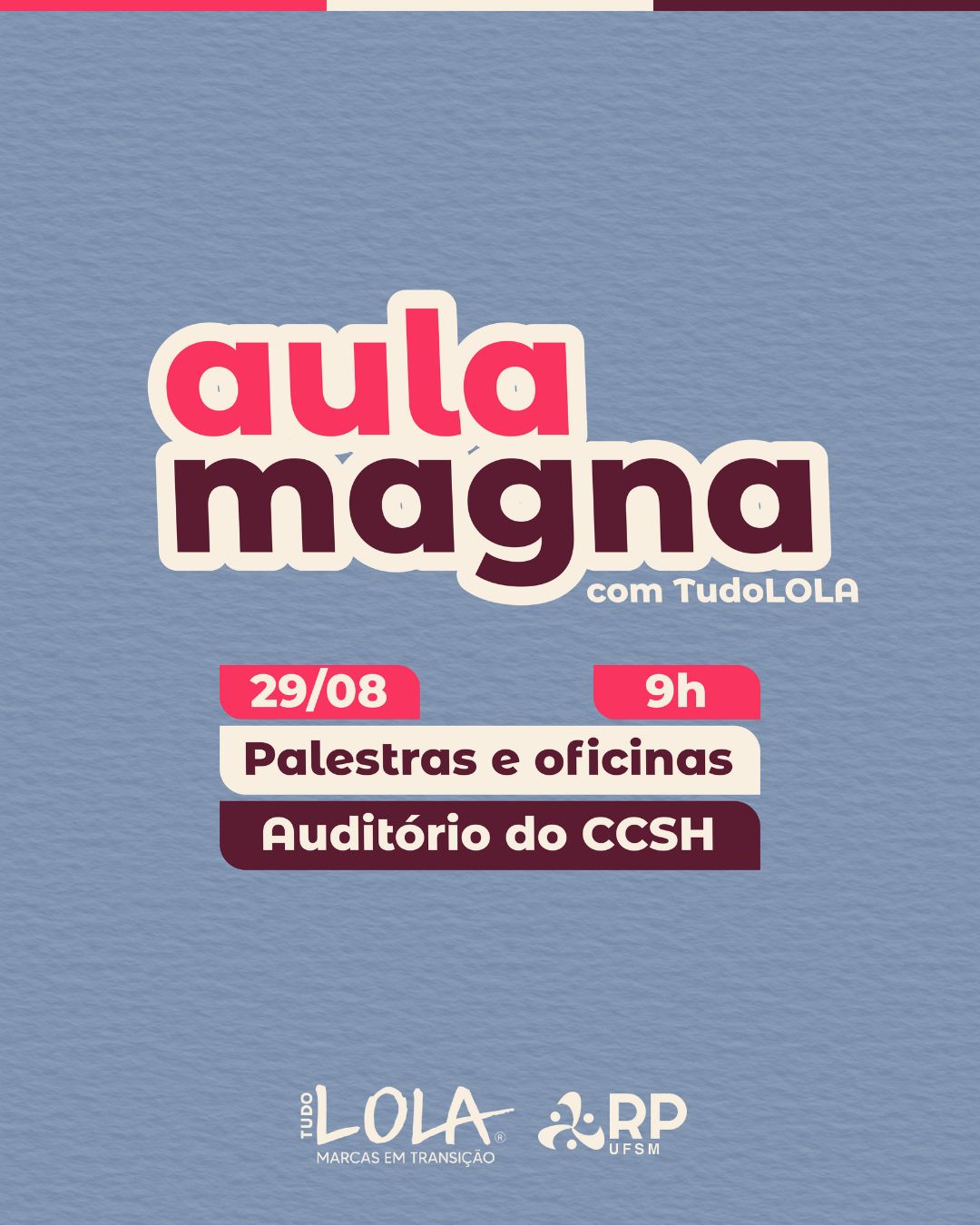 No dia 29 de agosto de 2025, a Aula Magna com a palestra “Cultura, Branding e C.A.O.S.”, ministrada por Daniela Pedroso e Lucas Kehrwald, fundadores da agência Tudo LOLA. O evento será às 9h, no Auditório do CCSH, e contará ainda com oficinas práticas às 13h30, em que os participantes poderão escolher uma das duas atividades: Social Selling ou Essência de Marca e Branding na Prática.