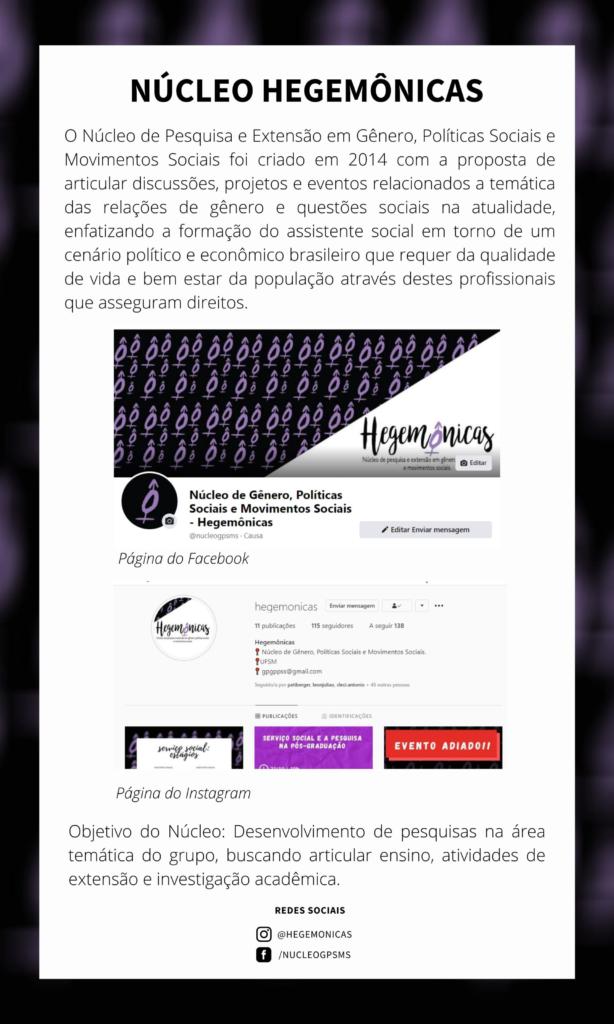 O Núcleo de Ensino, Pesquisa e Extensão em Gênero, Políticas Sociais e Movimentos Sociais foi criado em 2014 com a proposta de articular discussões, projetos e eventos relacionados a temática das relações de gênero e questões sociais na atualidade, enfatizando a formação do assistente social em torno de um cenário político e econômico brasileiro que requer da qualidade de vida e bem estar da população através destes profissionais que asseguram direitos.