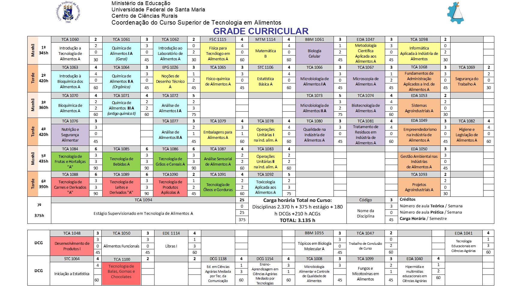 O Curso na versão 2023, confere ao profissional egresso, um conhecimento multidisciplinar, distribuídos numa carga de disciplinas obrigatórias de 2.745 horas, disciplinas complementares de graduação de 180 horas, atividades complementares de graduação de 210 horas, totalizando 3.135 horas. O curso é distribuido em três anos e meio (sete períodos), constituídos de atividades teóricas e práticas. O Estágio Curricular obrigatório (375 horas) pode ser desenvolvido em empresas (grandes, médias, pequenas e agroindústrias) voltadas à produção de alimentos, organizações públicas e privados em geral que atuam no setor de alimentos, tanto no Brasil quanto no exterior.