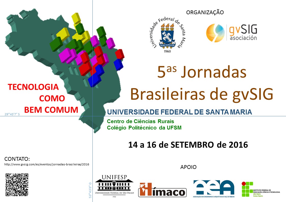 5ª Jornadas Brasileiras gvSIG, o gvSIG trata-se de um Sistema de Informação Geográfica (SIG) livre, ou seja, uma geotecnologia gratuita. O evento será sediado na UFSM, pelo Departamento de Engenharia Rural-CCR e Colégio Politécnico da UFSM do dia 14 á 16 de Setembro de 2016.
