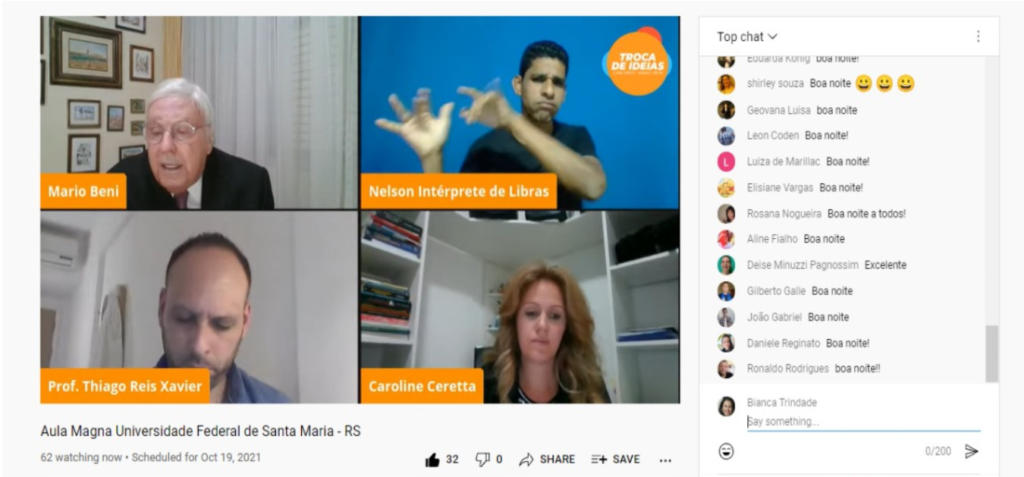 O evento, mediado pelo Professor Thiago Reis Xavier, coordenador do curso de Gestão de Turismo e pela professora Caroline Ciliane Ceretta, idealizadora da aula, também teve a participação da secretária do programa, Sra. Geslayne Ferreira, dos interpretes de libras, Diéssica e Nelson, e da aluna Beatriz Dorneles, que atuou como mestre de cerimônias. Os professores do Departamento de Turismo acompanharam a transmissão e se manifestaram através do chat.