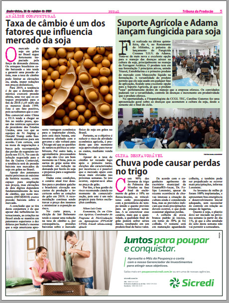 pois está mais barata, este mostra-se alinhado com o governo e não voltará para Chicago até que as questões de natureza política se estabilizem. Por outro lado, a agroindústria processadora de soja não vive um bom momento na China, pois os surtos de gripe suína têm resultado em redução na demanda por farelo de soja e prejuízos para o segmento asiático.