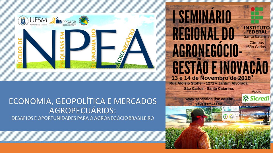 No último dia 14/11/2018, a convite do Instituto Federal Santa Cataria (IFSC) – Campus São Carlos, o Prof. Nilson Luiz Costa proferiu a palestra “Economia, geopolítica e mercados agropecuários: desafio e oportunidades para o agronegócio brasileiro”.