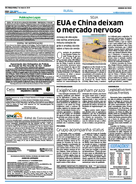 O Jornal Correio do Povo de hoje, 07/05/2019, traz uma reportagem sobre a conjuntura do mercado da soja nos Estados Unidos e seus impactos no Brasil.