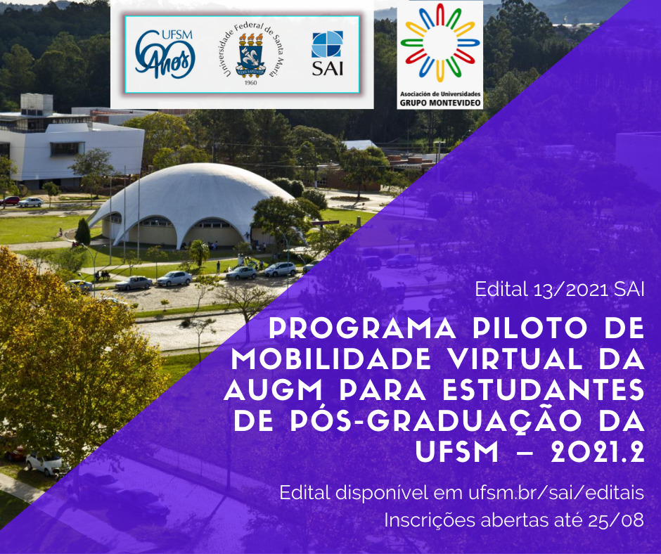 Através do edital 013/2021, as oportunidades de estudos virtuais no segundo semestre letivo de 2021 são ofertadas, com inscrições até o dia 25 de agosto de 2021, através do correio eletrônico sai.augm@ufsm.br, com o assunto: “Inscrição PPMVEPG da AUGM 2021.2”.