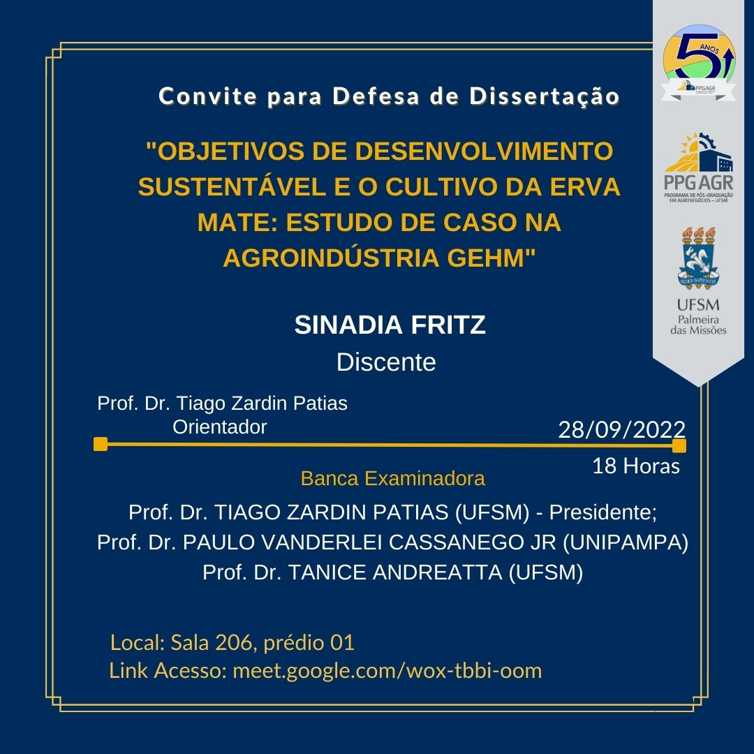 Convite para defesa de dissertação: OBJETIVOS DE DESENVOLVIMENTO SUSTENTÁVEL E O CULTIVO DA ERVA MATE: ESTUDO DE CASO NA AGROINDÚSTRIA GEHM