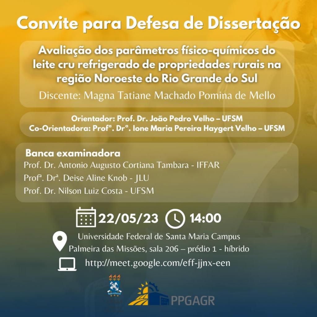 Convite para Defesa de Dissertação: “Avaliação dos parâmetros físico-químicos do leite cru refrigerado de propriedades rurais na região Noroeste do Rio Grande do Sul”