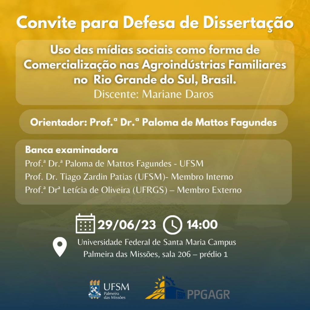 Convite para Defesa de Dissertação: “Uso das mídias sociais como forma de Comercialização nas Agroindústrias Familiares no Rio Grande do Sul”