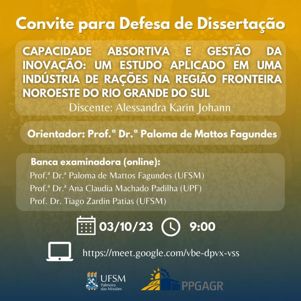 Defesa de Dissertação “Capacidade Absortiva e Gestão da Inovação: Um estudo aplicado em uma indústria de rações na região fronteira noroeste do Rio Grande do Sul.”