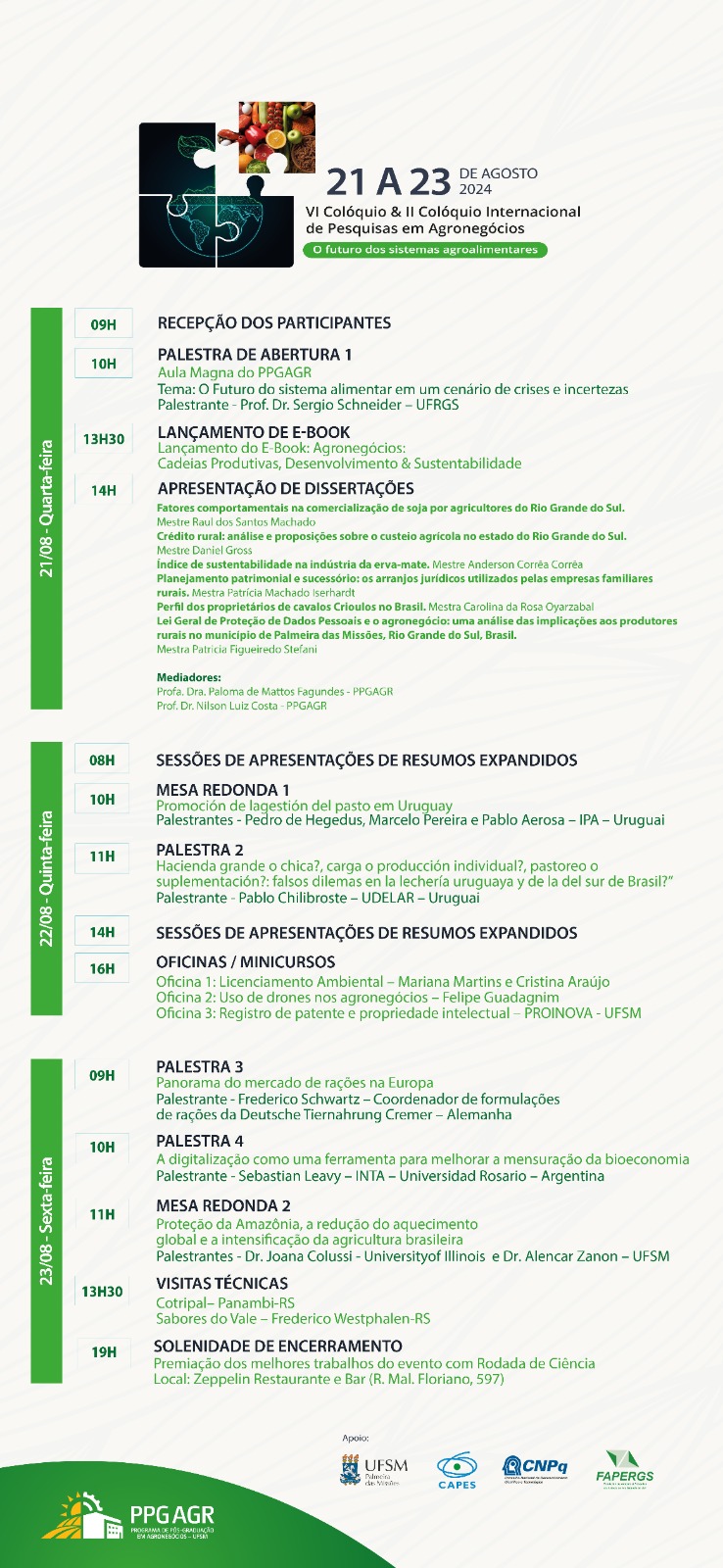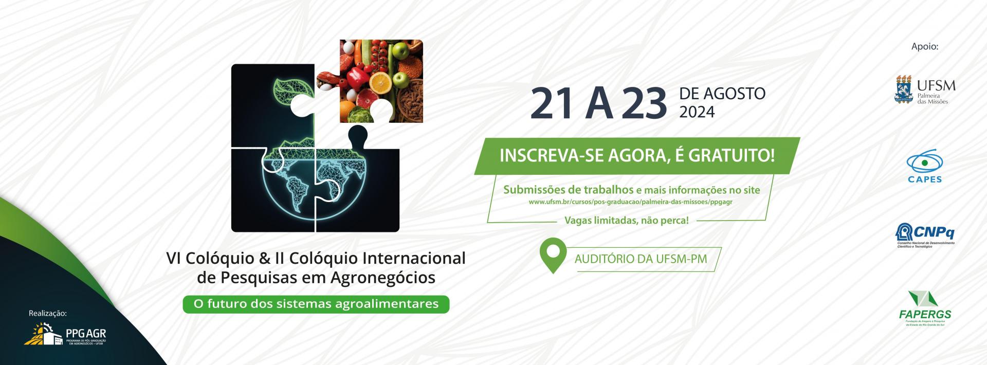 O Programa de Pós-graduação em Agronegócios promoverá de 21 a 23 de agosto de 2024 o VI Colóquio e II Colóquio Internacional de Pesquisas em Agronegócios.