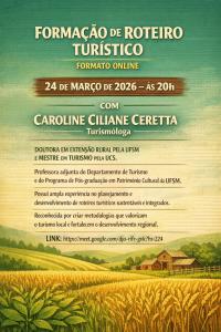 No dia 24 de março de 2026, foi realizada a formação de Roteiro Turístico, em formato online, no âmbito da disciplina de Formação em Extensão na Pós-Graduação II, do Programa de Pós-Graduação em Agronegócios, ministrada pela professora Dra. Rosani Spanevello. A atividade foi conduzida pela professora Dra. Caroline Ciliane Ceretta, docente do Departamento de Turismo e do Programa de Pós-Graduação em Patrimônio Cultural da UFSM, e teve como foco a discussão sobre a estruturação e implementação do turismo em espaços rurais. Durante a formação, foram abordadas possibilidades de desenvolvimento do turismo rural no contexto de Palmeira das Missões, com ênfase nas propriedades de produtores de erva-mate, destacando os atores envolvidos, as estratégias de organização e os potenciais retornos econômicos e sociais para os produtores. A atividade possibilitou aos estudantes a aproximação com aspectos práticos do planejamento turístico, contribuindo para a construção de propostas aplicadas ao contexto regional.