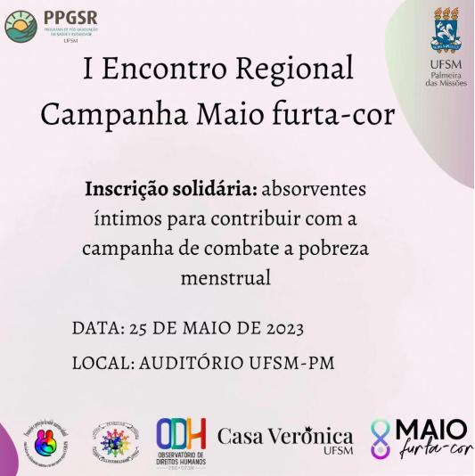 Dessa maneira, no dia 25 de maio, a Universidade Federal de Santa Maria, campus Palmeira das Missões, através do Grupo GENVULC (Grupo de Ensino Pesquisa e Extensão em Gênero, Vulnerabilidade e Cuidado em Saúde) e do Programa de Pós-Graduação em Saúde e Ruralidade, irá promover, no auditório do campus, o I Encontro Regional Campanha Maio Furta-Cor.