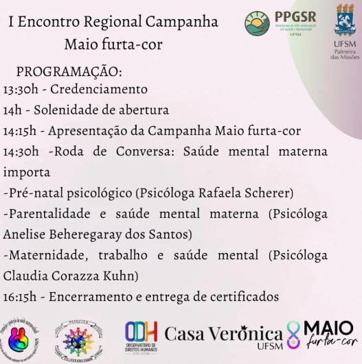 O evento irá iniciar às 13h30min com uma abertura e apresentação sobre a campanha Maio furta-cor. Às 14h30min, será realizada a Roda de Conversa “Saúde mental materna importa”, com as psicólogas Rafaela Scherer, Anelise Beheregaray dos Santos e Claudia Corazza Kuhn. O evento é aberto a toda comunidade. As inscrições solidárias são absorventes íntimos para contribuir com a campanha de combate à pobreza menstrual.