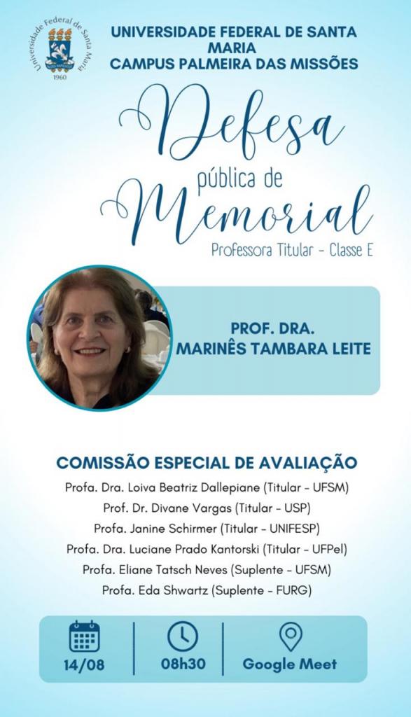 No dia 14 de agosto às 8h30, via Google Meet, a Docente Marinês Tambara Leite, do Programa de Pós-Graduaçäo em Saúde e Ruralidade realizará sua Defesa de Memorial para Professora Titular – Classe E.