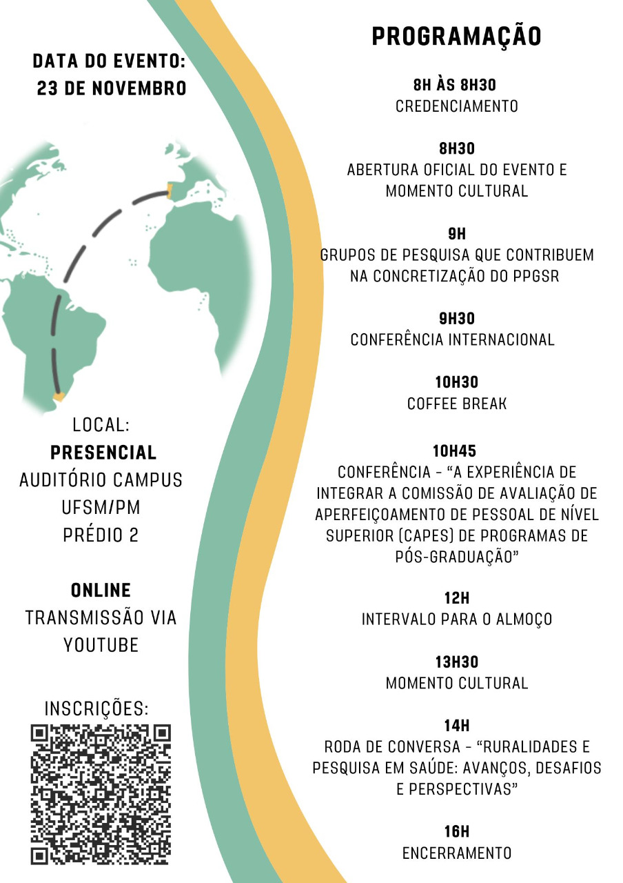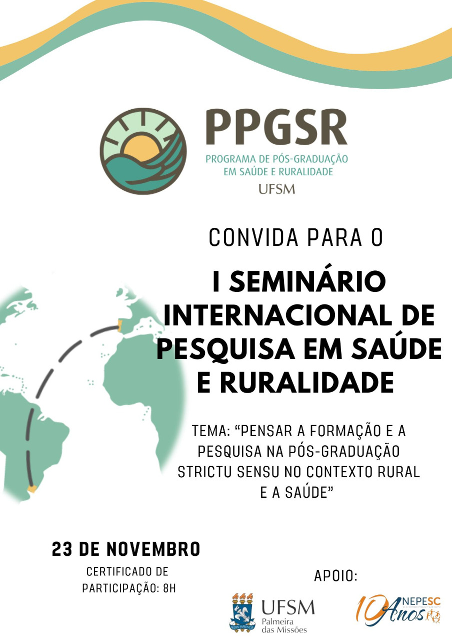 O Programa de Pós-Graduação em Saúde e Ruralidade da Universidade Federal de Santa Maria – Campus Palmeira das Missões informa que estão abertas as inscrições para o I Seminário Internacional de Pesquisa em Saúde e Ruralidade.