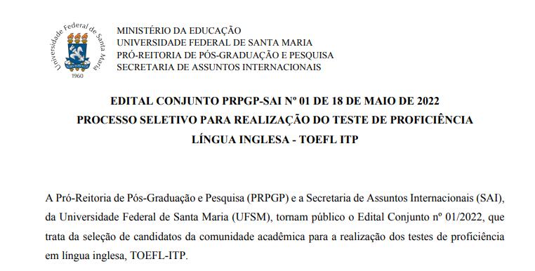 Teste de suficiência 2022/1Prezados (as) Discentes: Segue link referente ao teste de suficiência 2022/1. https://portal.ufsm.br/concursos/inscricao/opcoes.html?edicao=4366 solicitamos que fiquem atentos (as) aos prazos. Atenciosamente, SADPOS/CCSH