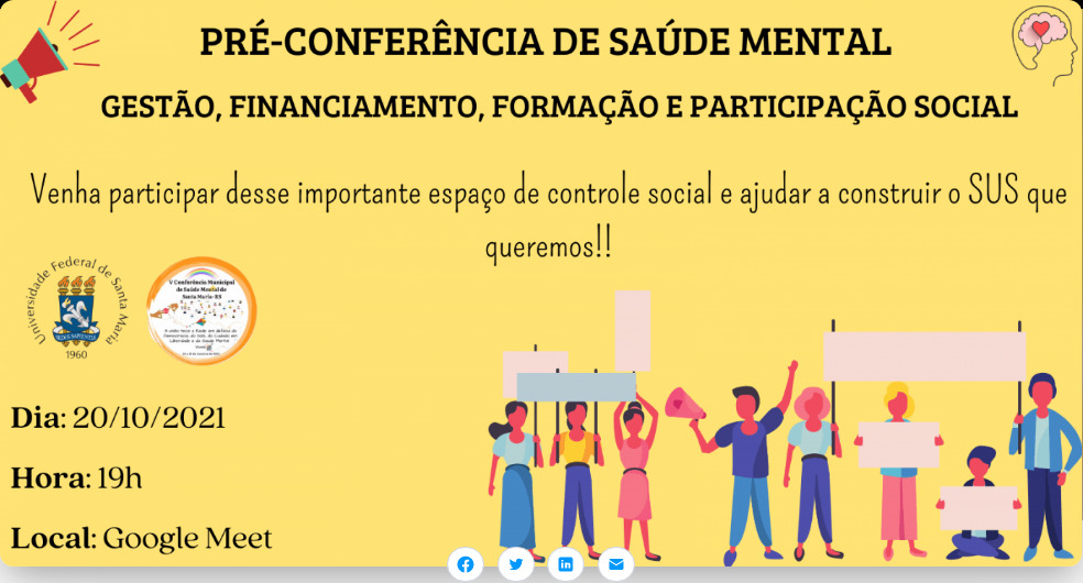 O PPG-MPCS divulga a Pré-Conferência de Saúde Mental de Santa Maria que acontecerá nesta quarta feira (20/10) das 19h às 21h através da plataforma Google Meet.
