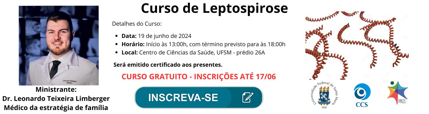 O Curso de Pós-Graduação Mestrado Profissional em Ciências da Saúde (MPCS) anuncia a realização do curso de capacitação em Leptospirose, ministrado pelo Dr. Leonardo Teixeira Limberger. Este evento faz parte do projeto de extensão “Cursos de Capacitação para Assistência Farmacêutica (FIEX-2024)”, coordenado pela Profª Dra. Rosmari Horner do Departamento de Análises Clínicas e Toxicológicas conjuntamente com o MPCS que visa melhorar a qualidade da assistência farmacêutica na rede municipal de Santa Maria.