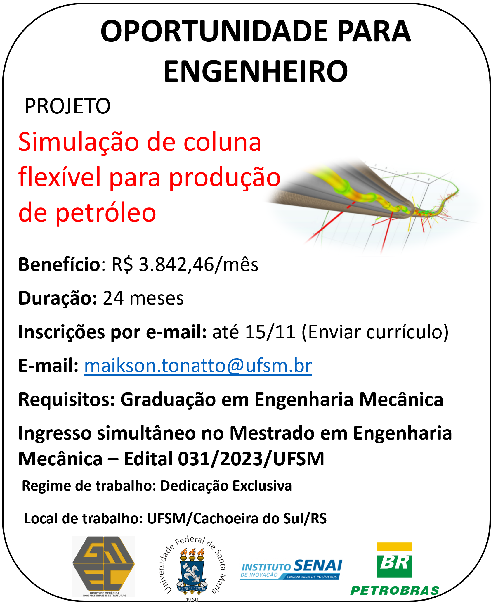 O Programa de Pós-Graduação em Engenharia Mecânica divulga a oportunidade de participação em projeto como bolsista de mestrado em projeto de pesquisa financiado pela empresa Petrobras em parceria com o ISI Polímeros/SENAI.