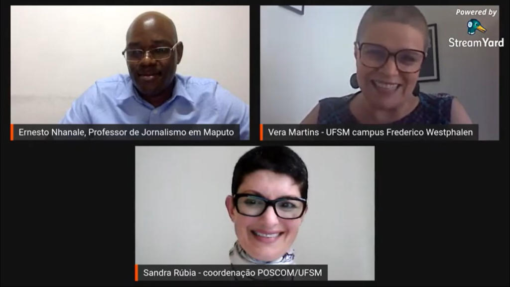 A live foi mediada pela professora Vera Martins (UFSM/FW), egressa do POSCOM, que fez estágio de doutorado-sanduíche em Moçambique, na Universidade Pedagógica de Maputo.