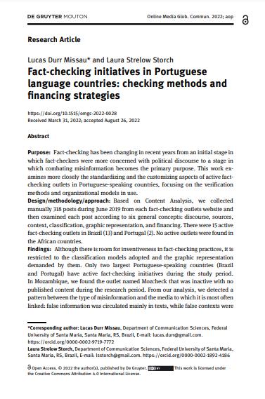 Durr Missau, Lucas and Storch, Laura Strelow. “Fact-checking initiatives in Portuguese language countries: checking methods and financing strategies” Online Media and Global Communication, 2022. https://doi.org/10.1515/omgc-2022-0028