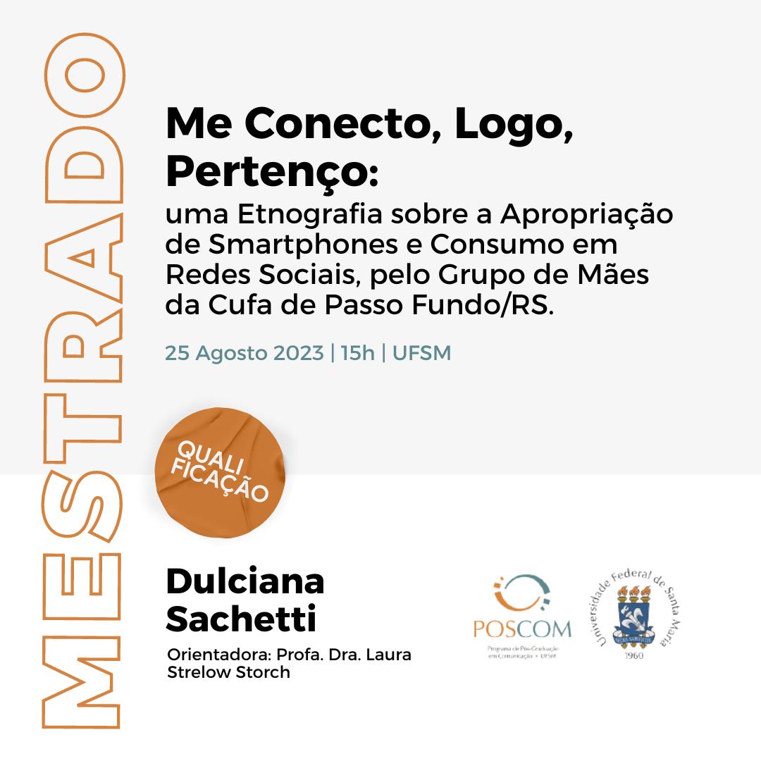 O Programa de Pós-Graduação em Comunicação divulga a banca de qualificação de mestrado da aluna Dulciana Sachetti, com o título “Me Conecto, Logo, Pertenço: uma Etnografia sobre a Apropriação de Smartphones e Consumo em Redes Sociais, pelo Grupo de Mães da Cufa de Passo Fundo/RS”, que ocorrerá no dia 25 de agosto, às 15 horas.