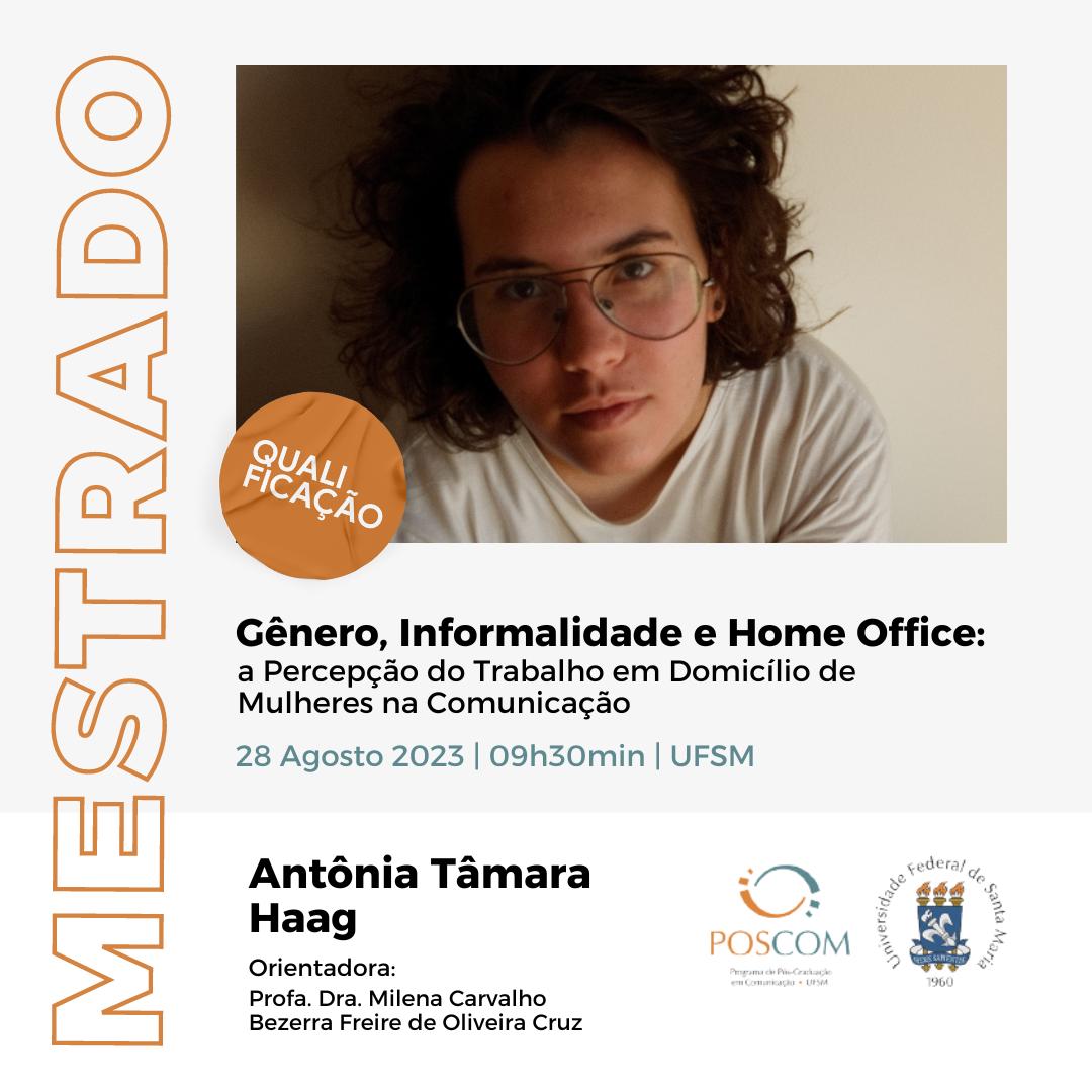O Programa de Pós-Graduação em Comunicação divulga a banca de qualificação de mestrado da aluna Antônia Tâmara Haag, com o título “Gênero, Informalidade e Home Office: a Percepção do Trabalho em Domicílio de Mulheres na Comunicação”, que ocorrerá no dia 28 de agosto, às 9h30min, na UFSM.
